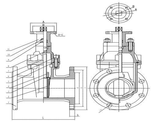 | | 2 | Disc: | GGG50+EPDM | Dn | L(mm) | | 3 | stem: | 2Cr12 | 50 | 150 | | 4 | stem nut: | GGG50/Brass | 65 | 170 | | 5 | O ring | EPDM | 80 | 180 | | 6 | stud: | steel #35 | 100 | 190 | | 7 | bonnet: | GGG50 | 125 | 200 | | 8 | O ring : | NBR | 150 | 210 | | 9 | nut: | #35 | 200 | 230 | | 10 | stud: | #35 | 250 | 250 | | 11 | cover : | GGG50 | 300 | 270 |